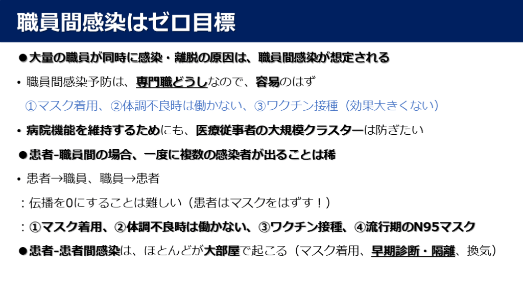●患者-患者間感染は、ほとんどが大部屋で起こる(マスク着用、早期診断・隔離、換気) 職員間感染はゼロ目標 #98.