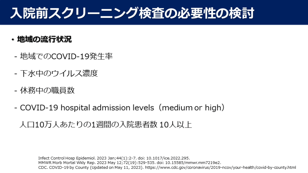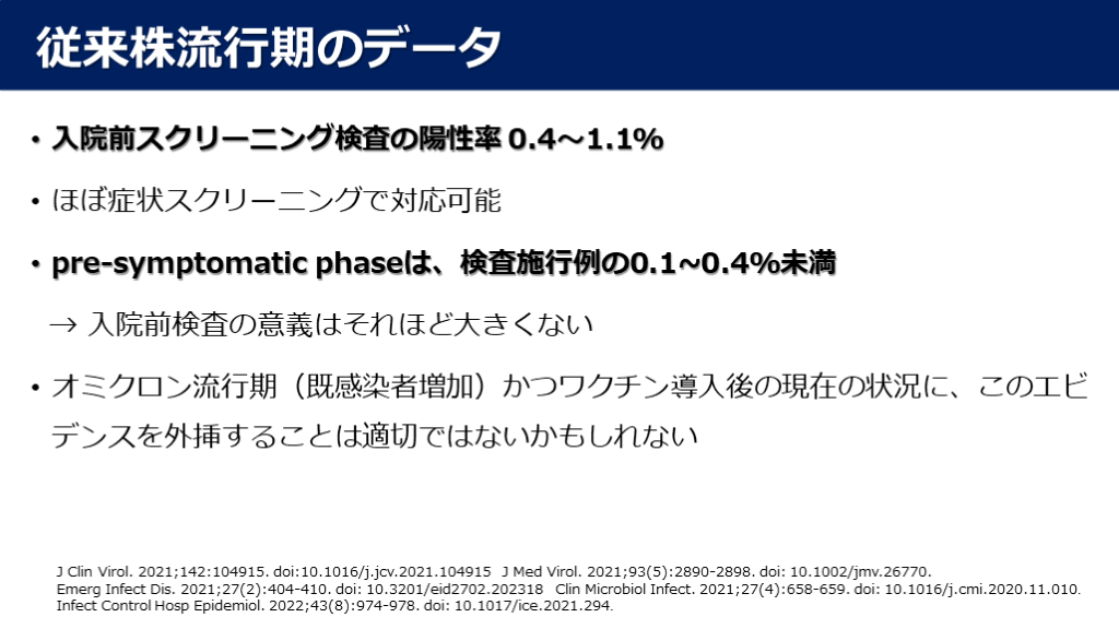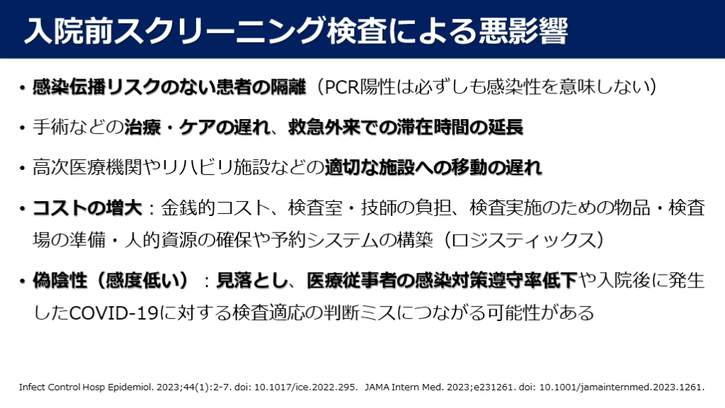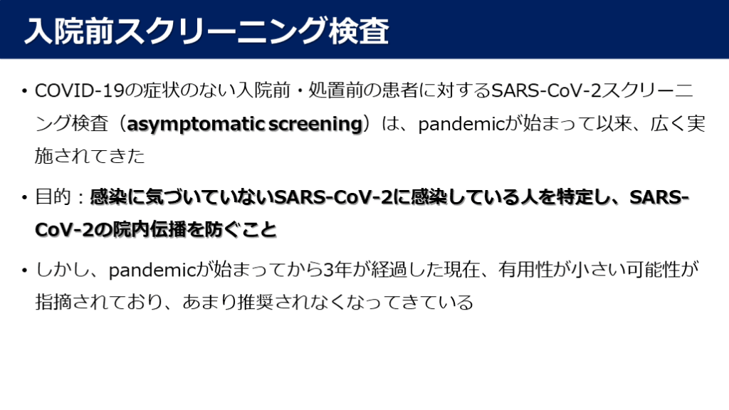 しかし、pandemicが始まってから3年が経過した現在、有用性が小さい可能性が指摘されており、あまり推奨されなくなってきている 入院前スクリーニング検査 #103.