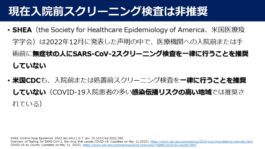 入院前SARS-CoV-2スクリーニング検査 ・SHEA(the Society for Healthcare Epidemiology of America、米国医療疫学学会)は、医療機関への入院前または手術前に無症状の人にSARS-CoV-2スクリーニング検査を一律に行うことを推奨していない