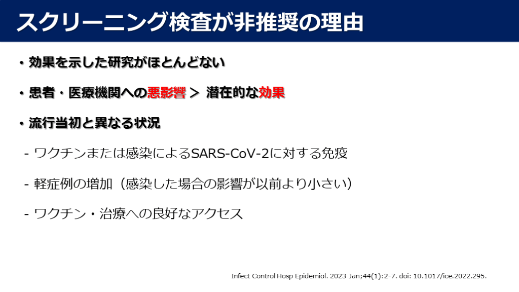 - ワクチン・治療への良好なアクセス Infect Control Hosp Epidemiol. 2023 Jan;44(1):2-7. doi: 10.1017/ice.2022.295. スクリーニング検査が非推奨の理由 #106.