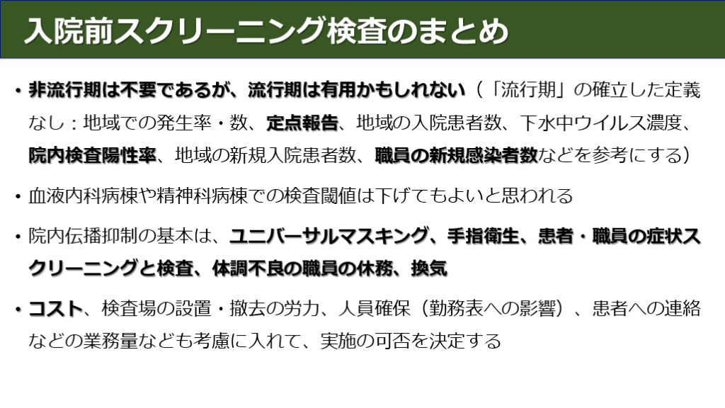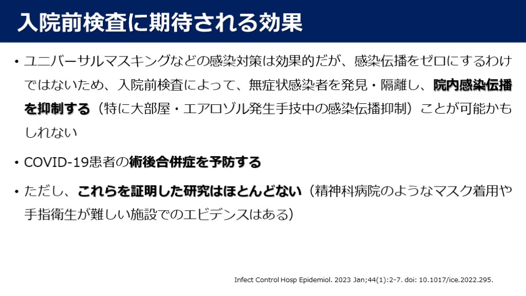 ユニバーサルマスキングなどの感染対策は効果的だが、感染伝播をゼロにするわけではないため、入院前検査によって、無症状感染者を発見・隔離し、院内感染伝播を抑制する(特に大部屋・エアロゾル発生手技中の感染伝播抑制)ことが可能かもしれない