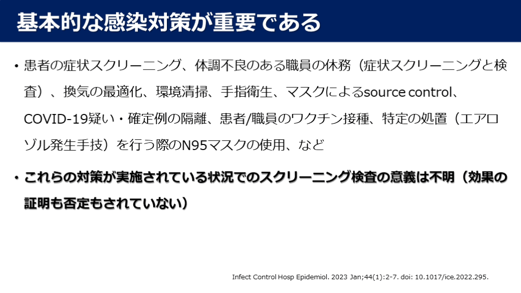 ただし、これらを証明した研究はほとんどない(精神科病院のようなマスク着用や手指衛生が難しい施設でのエビデンスはある) Infect Control Hosp Epidemiol. 2023 Jan;44(1):2-7. doi: 10.1017/ice.2022.295. 入院前検査に期待される効果 #107.