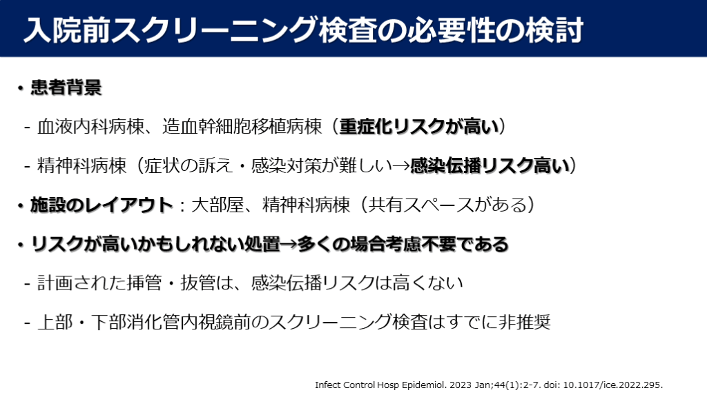 - 上部・下部消化管内視鏡前のスクリーニング検査はすでに非推奨 Infect Control Hosp Epidemiol. 2023 Jan;44(1):2-7. doi: 10.1017/ice.2022.295. 入院前スクリーニング検査の必要性の検討 #111.