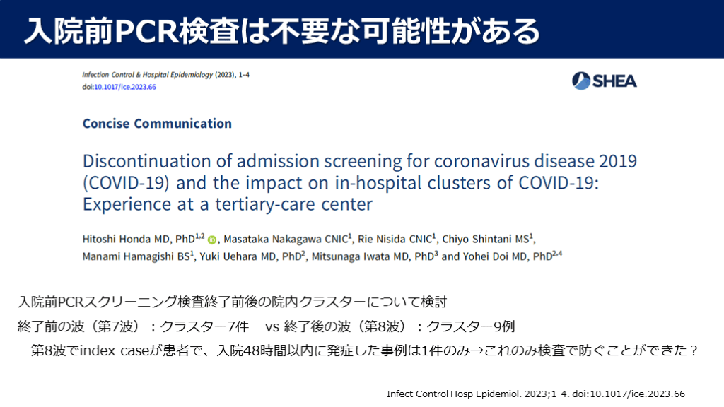 入院前PCR検査は不要な可能性がある Infect Control Hosp Epidemiol. 2023;1-4. doi:10.1017/ice.2023.66 入院前PCRスクリーニング検査終了前後の院内クラスターについて検討