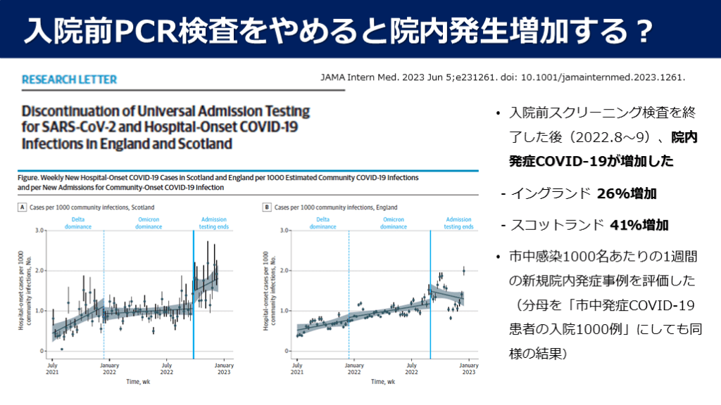 入院前PCR検査をやめると院内発生増加する? JAMA Intern Med. 2023 Jun 5;e231261. doi: 10.1001/jamainternmed.2023.1261. 入院前スクリーニング検査を終了した後(2022.8~9)、院内発症COVID-19が増加した