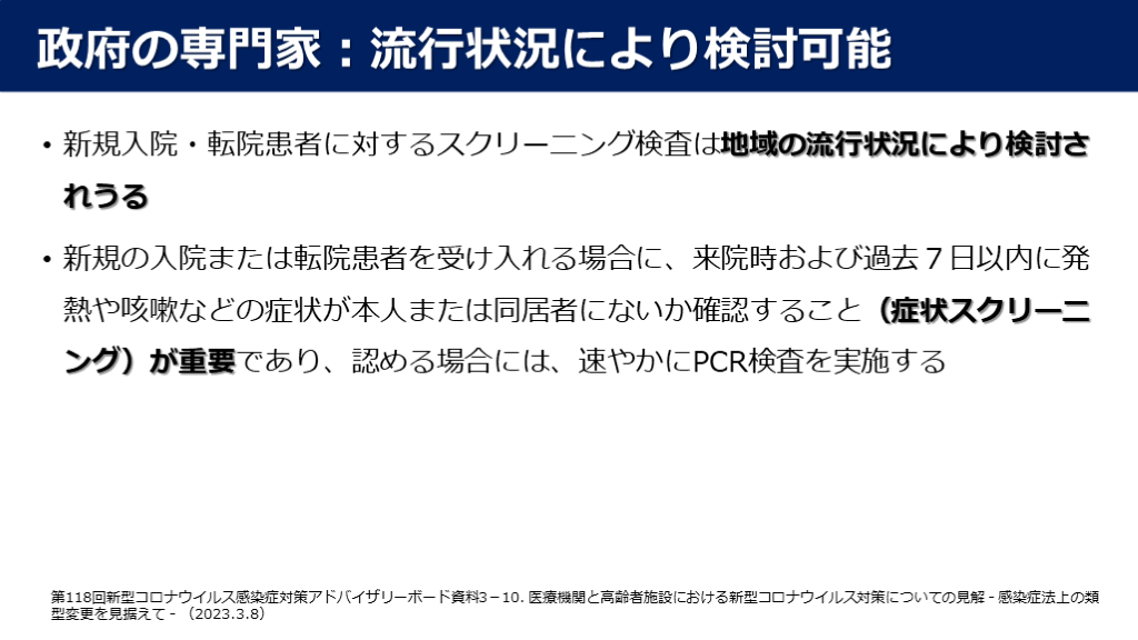新規の入院または転院患者を受け入れる場合に、来院時および過去7日以内に発熱や咳嗽などの症状が本人または同居者にないか確認すること(症状スクリーニング)が重要であり、認める場合には、速やかにPCR検査を実施する 第118回新型コロナウイルス感染症対策アドバイザリーボード資料3-10. 医療機関と高齢者施設における新型コロナウイルス対策についての見解 - 感染症法上の類型変更を見据えて - (2023.3.8) 政府の専門家:流行状況により検討可能 ウィズコロナ時代の社会と医療の変化 #115.