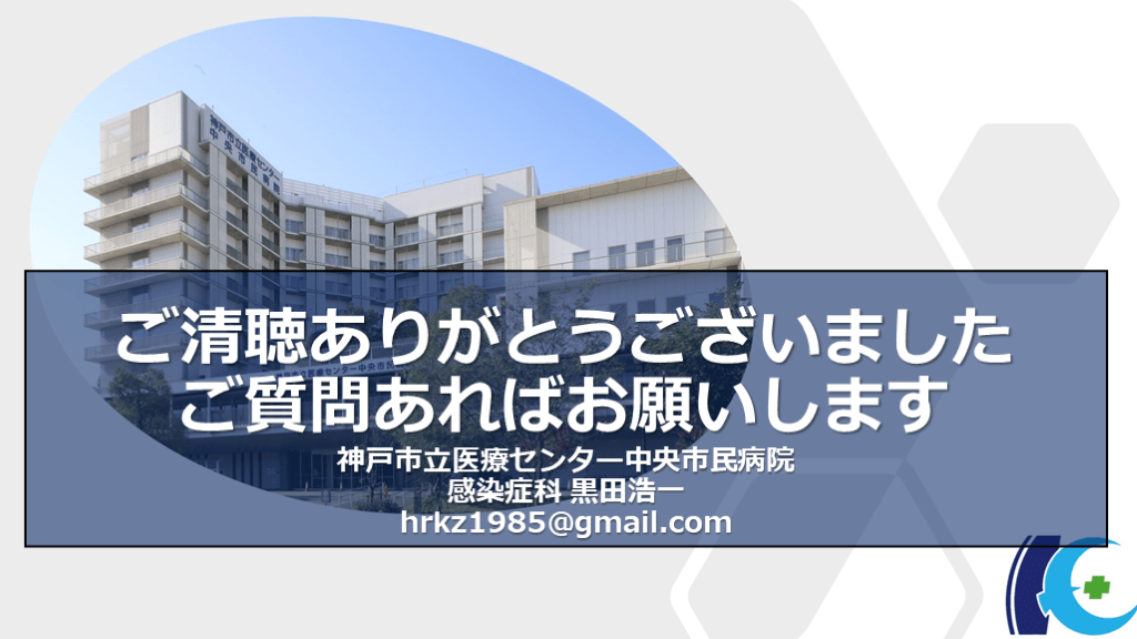 ご清聴ありがとうございましたご質問あればお願いします神戸市立医療センター中央市民病院感染症科 黒田浩一hrkz1985@gmail.com