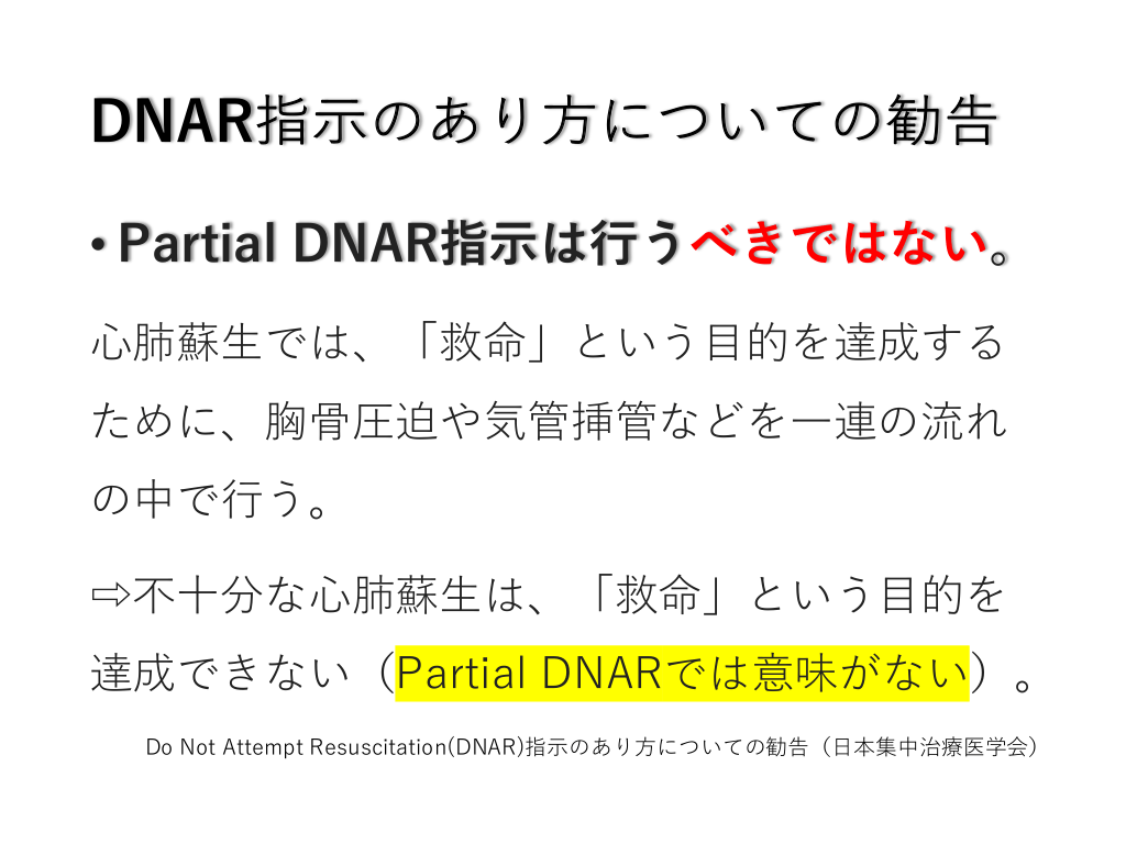 #13. DNAR指⽰のあり⽅についての勧告 • Partial DNAR指⽰は⾏うべきではない。 ⼼肺蘇⽣では、「救命」という⽬的を達成する ために、胸⾻圧迫や気管挿管などを⼀連の流れ の中で⾏う。 ⇨不⼗分な⼼肺蘇⽣は、「救命」という⽬的を 達成できない(Partial DNARでは意味がない)。 Do Not Attempt Resuscitation(DNAR)指⽰のあり⽅についての勧告(⽇本集中治療医学会)