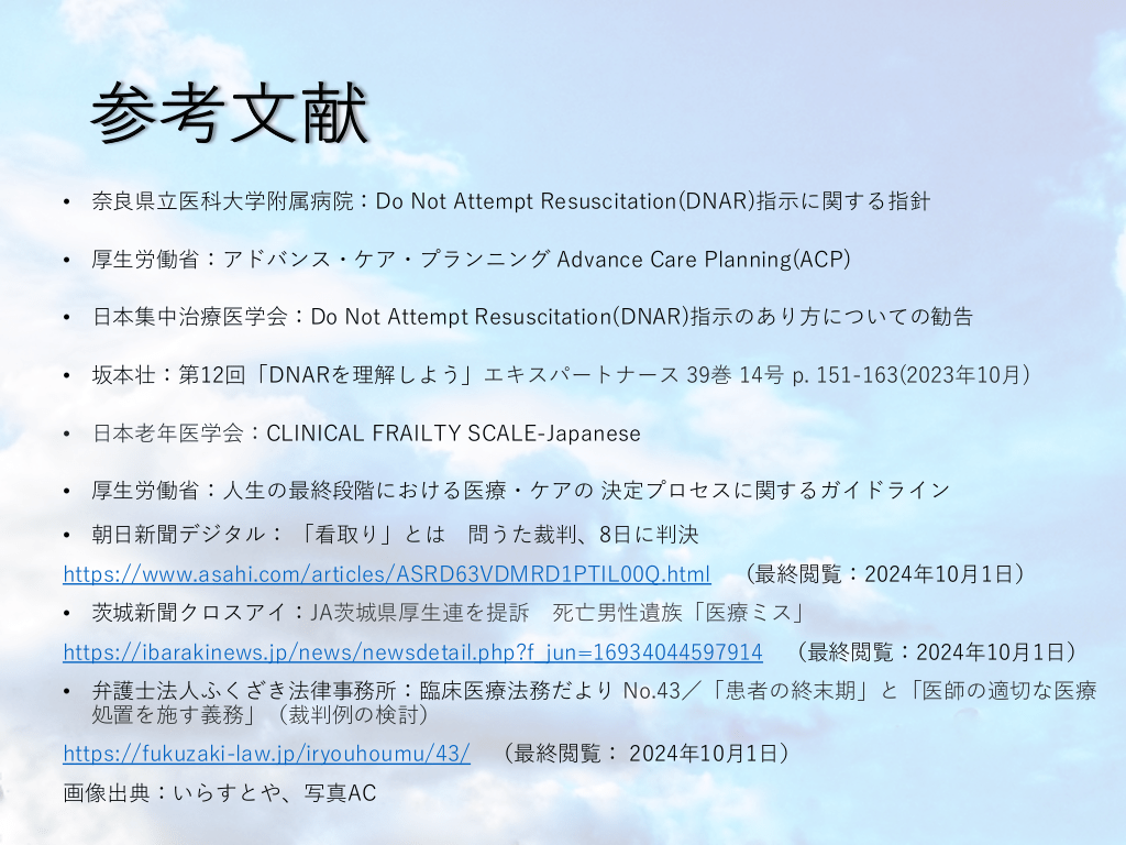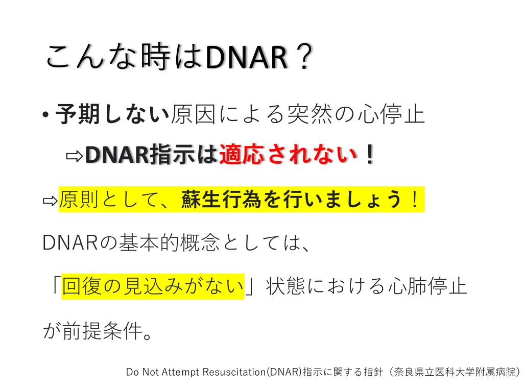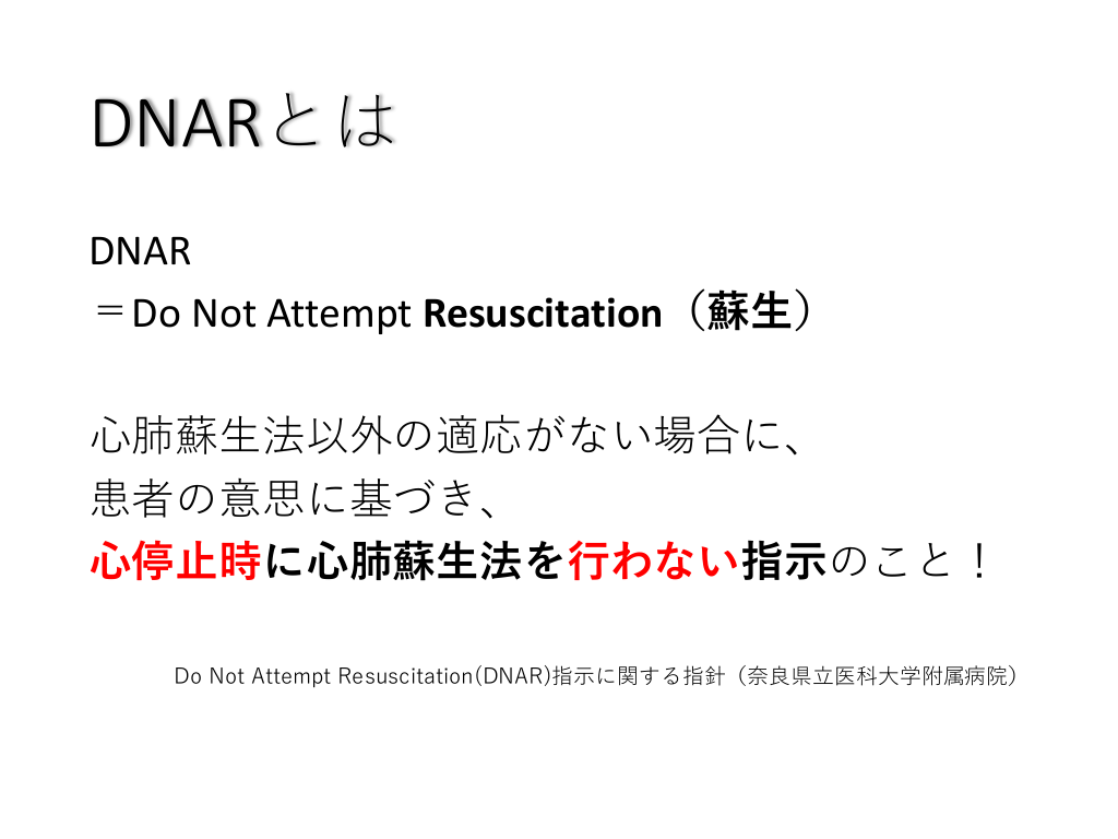 #6. DNARとは DNAR =Do Not Attempt Resuscitation(蘇⽣) ⼼肺蘇⽣法以外の適応がない場合に、 患者の意思に基づき、 ⼼停⽌時に⼼肺蘇⽣法を⾏わない指⽰のこと! Do Not Attempt Resuscitation(DNAR)指⽰に関する指針(奈良県⽴医科⼤学附属病院)