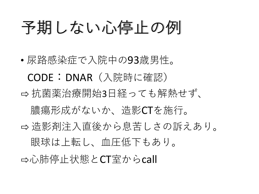 #15. 予期しない⼼停⽌の例 • 尿路感染症で⼊院中の93歳男性。 CODE:DNAR(⼊院時に確認) ⇨ 抗菌薬治療開始3⽇経っても解熱せず、 膿瘍形成がないか、造影CTを施⾏。 ⇨ 造影剤注⼊直後から息苦しさの訴えあり。 眼球は上転し、⾎圧低下もあり。 ⇨⼼肺停⽌状態とCT室からcall