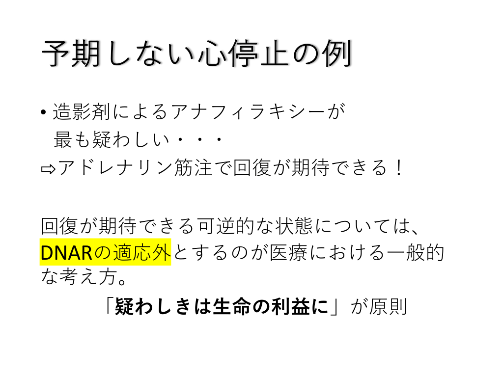 #16. 予期しない⼼停⽌の例 • 造影剤によるアナフィラキシーが 最も疑わしい・・・ ⇨アドレナリン筋注で回復が期待できる! 回復が期待できる可逆的な状態については、 DNARの適応外とするのが医療における⼀般的 な考え⽅。 「疑わしきは⽣命の利益に」が原則