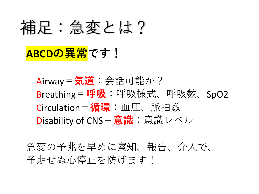 #18. 補⾜:急変とは? ABCDの異常です! Airway=気道:会話可能か? Breathing=呼吸:呼吸様式、呼吸数、SpO2 Circulation=循環:⾎圧、脈拍数 Disability of CNS=意識:意識レベル 急変の予兆を早めに察知、報告、介⼊で、 予期せぬ⼼停⽌を防げます!