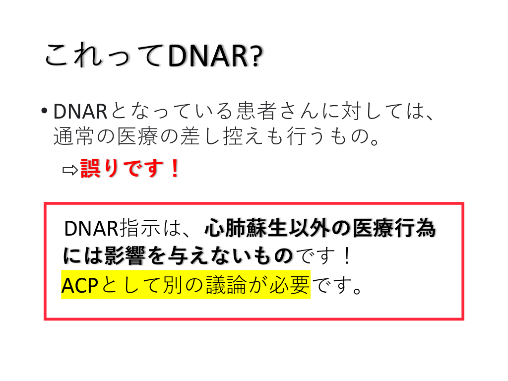 #19. これってDNAR? • DNARとなっている患者さんに対しては、 通常の医療の差し控えも⾏うもの。 ⇨誤りです! DNAR指⽰は、⼼肺蘇⽣以外の医療⾏為 には影響を与えないものです! ACPとして別の議論が必要です。