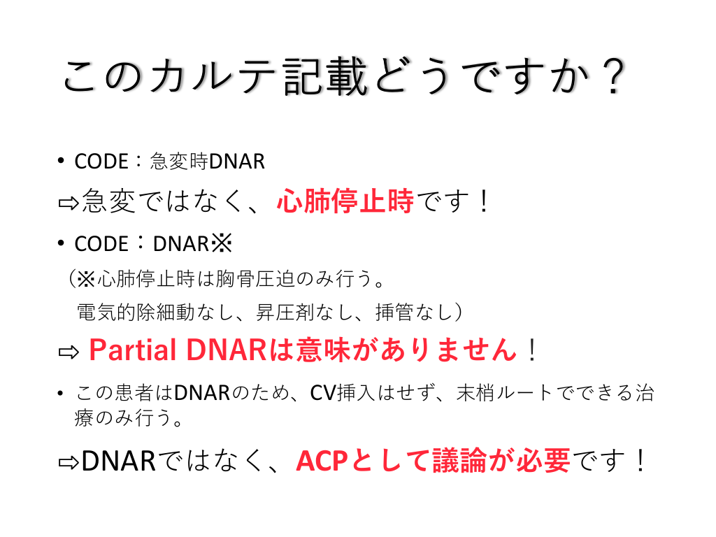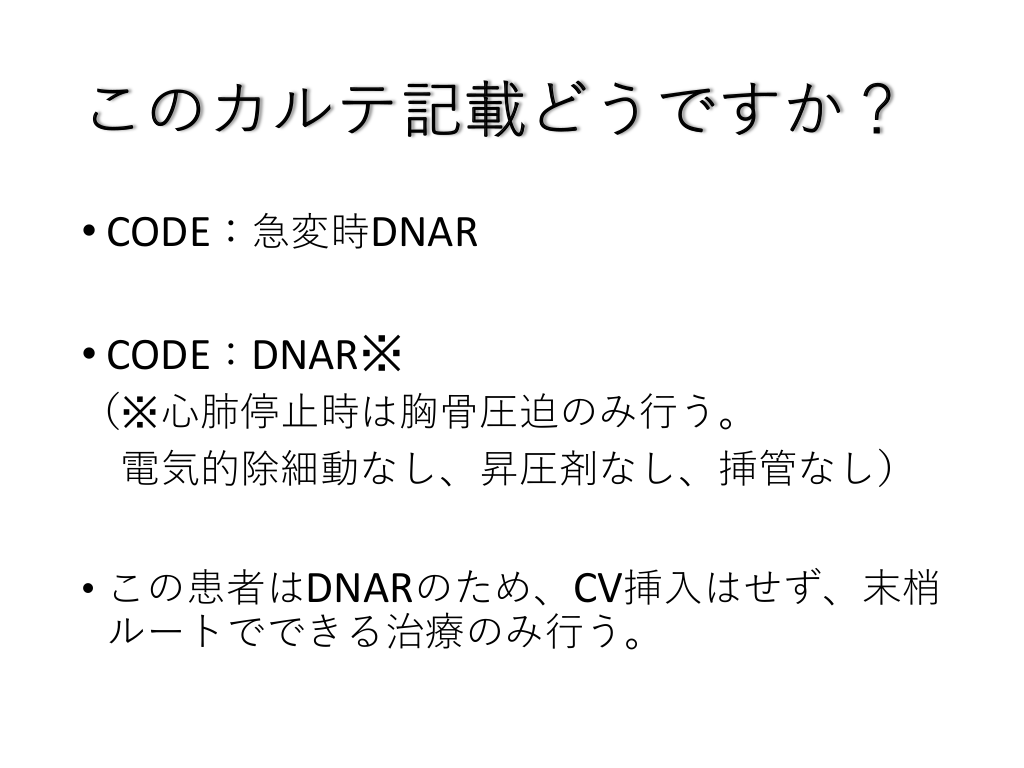#3. このカルテ記載どうですか? • CODE:急変時DNAR • CODE:DNAR※ (※⼼肺停⽌時は胸⾻圧迫のみ⾏う。 電気的除細動なし、昇圧剤なし、挿管なし) • この患者はDNARのため、CV挿⼊はせず、末梢 ルートでできる治療のみ⾏う。