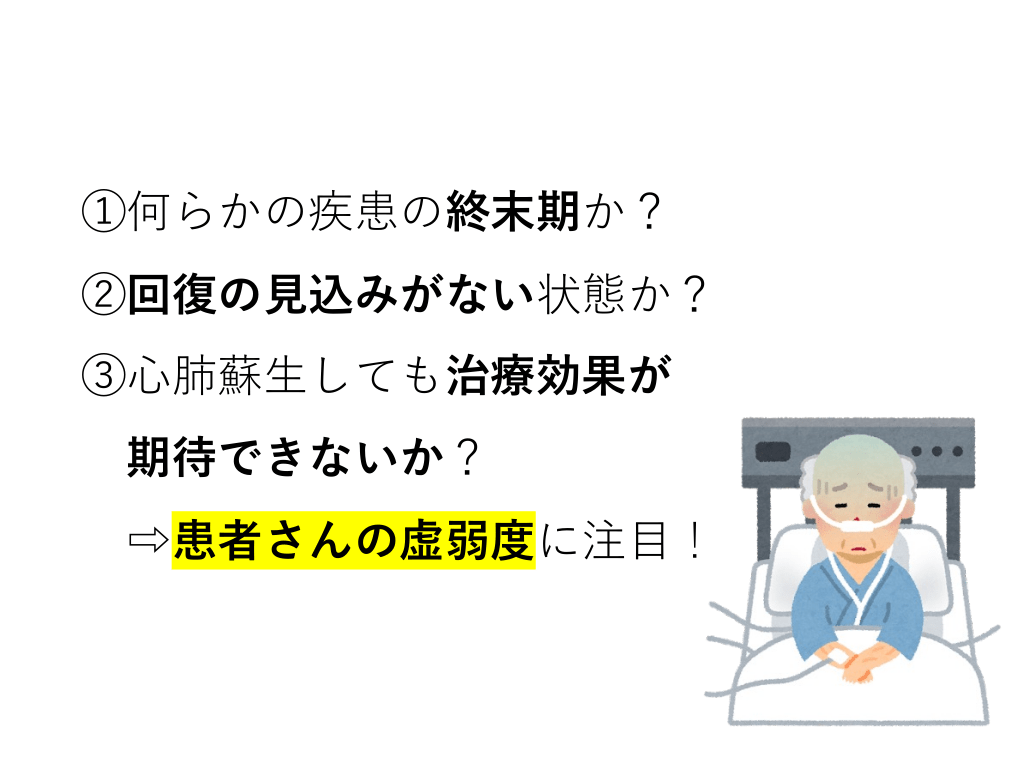 #24. ①何らかの疾患の終末期か? ②回復の⾒込みがない状態か? ③⼼肺蘇⽣しても治療効果が 期待できないか? ⇨患者さんの虚弱度に注⽬!
