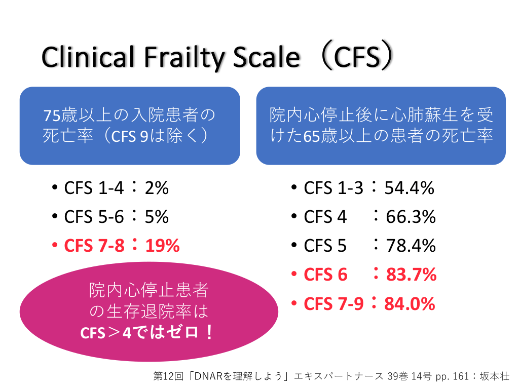 #25. Clinical Frailty Scale(CFS) 75歳以上の⼊院患者の 死亡率(CFS 9は除く) • CFS 1-4:2% • CFS 5-6:5% • CFS 7-8:19% 院内⼼停⽌患者 の⽣存退院率は CFS>4ではゼロ! 院内⼼停⽌後に⼼肺蘇⽣を受 けた65歳以上の患者の死亡率 • CFS 1-3:54.4% • CFS 4 :66.3% • CFS 5 :78.4% • CFS 6 :83.7% • CFS 7-9:84.0% 第12回「DNARを理解しよう」エキスパートナース 39巻 14号 pp. 161:坂本壮
