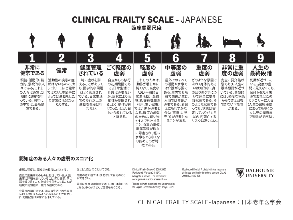 #26. CLINICAL FRAILTY SCALE - JAPANESE 臨床虚弱尺度 1 非常に 健常である 頑健、活動的、精 力的、意欲的な人 々である。 これら の人々は通常、定 期的に運動を行 っている。同年代 の中では、最も健 常である。 2 健常 3 4 健康管理 ごく軽度の されている 虚弱 5 活動性の疾患の症 時に症状を訴 自立からの移行 状はないものの、カ えることがあって の初期段階であ テゴリー1ほど健常 も、医学的な問題 る。日常生活で ではない。季節等に はよく管理され 介護は必要ない よっては運動をした ている。日常生活 が、症状により活 り非常に活発だっ での歩行以上の 動性が制限され たりする。 運動を普段は行 る。 よく 「動作が鈍 わない。 くなった」とか、日 中から疲れている と訴える。 軽度の 虚弱 6 中等度の 虚弱 7 重度の 虚弱 8 非常に重 度の虚弱 9 人生の 最終段階 これらの人々は、 屋外でのすべて どのような原因で 完全に要介議状 死期が近づいて 動作が明らかに の活動や家事で あれ(身体的ある 態であり、人生の いる。高度の虚 鈍くなり、高度な は介護が必要で いは知的な)、身 最終段階が近づ 弱に見えなくても、 IADL(手段的日 ある。屋内でも階 の回りのケアにつ いている。典型的 余命が6カ月未 常生活動) (金銭 段で問題が生じ、 いて完全に要介 には、軽度な疾患 満であればこの 管理、交通機関の 入浴では介護が 護状態である。 そ からでさえ回復 カテゴリーに入る 利用、重い家事) 必要である。着替 のような状態であ できない可能性 (人生の最終段階 では介助が必要と えにもわずかな っても、状態は安 がある。 にあっても多くの なる。軽度の虚弱 介助(声掛け、見 定しており (6カ月 人は死の間際ま のために、買い物 守り)が必要とな 以内で)死亡する で運動ができる)。 や1人で外出する ることがある。 リスクは高くない。 こと、食事の準備、 服薬管理が徐々 に障害され、軽い 家事もできなくな り始めるのが特 徴である。 認知症のある人々の虚弱のスコア化 虚弱の程度は、認知症の程度に対応する。 直近の出来事そのものは記憶しているが、出 来事の詳細を忘れて