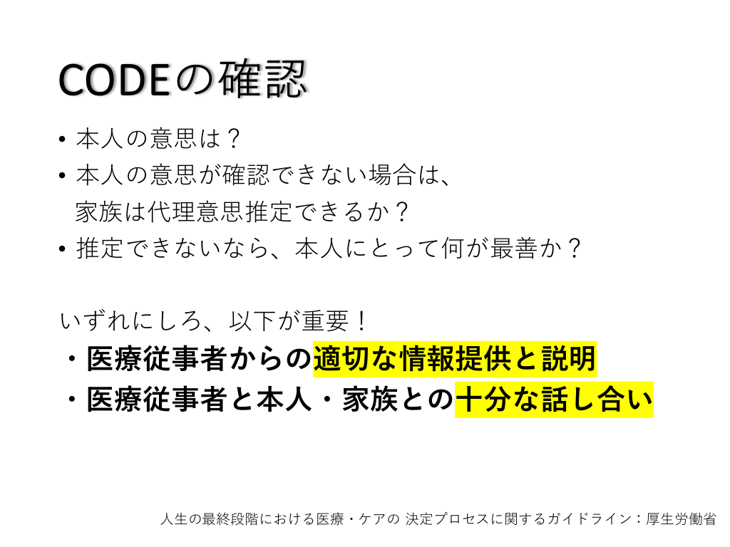 #27. CODEの確認 • 本⼈の意思は? • 本⼈の意思が確認できない場合は、 家族は代理意思推定できるか? • 推定できないなら、本⼈にとって何が最善か? いずれにしろ、以下が重要! ・医療従事者からの適切な情報提供と説明 ・医療従事者と本⼈・家族との⼗分な話し合い ⼈⽣の最終段階における医療・ケアの 決定プロセスに関するガイドライン:厚⽣労働省