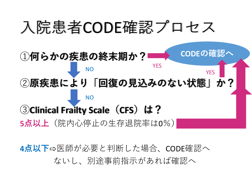 #28. ⼊院患者CODE確認プロセス ①何らかの疾患の終末期か? NO CODEの確認へ YES YES ②原疾患により「回復の⾒込みのない状態」か? NO ③Clinical Frailty Scale(CFS)は? 5点以上(院内⼼停⽌の⽣存退院率は0%) 4点以下⇨医師が必要と判断した場合、CODE確認へ ないし、別途事前指⽰があれば確認へ