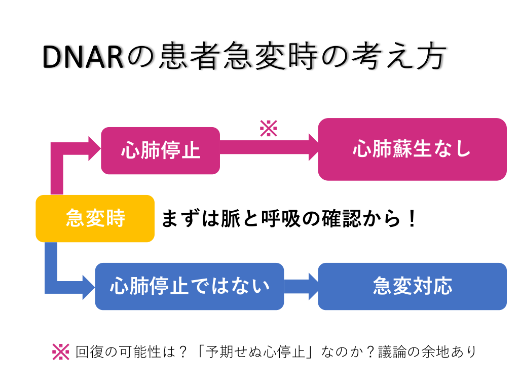 #29. DNARの患者急変時の考え⽅ ※ ⼼肺停⽌ 急変時 ⼼肺蘇⽣なし まずは脈と呼吸の確認から! ⼼肺停⽌ではない 急変対応 ※ 回復の可能性は?「予期せぬ⼼停⽌」なのか?議論の余地あり