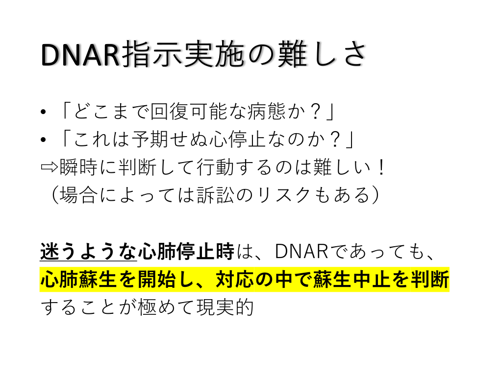 #30. DNAR指⽰実施の難しさ • 「どこまで回復可能な病態か?」 • 「これは予期せぬ⼼停⽌なのか?」 ⇨瞬時に判断して⾏動するのは難しい! (場合によっては訴訟のリスクもある) 迷うような⼼肺停⽌時は、DNARであっても、 ⼼肺蘇⽣を開始し、対応の中で蘇⽣中⽌を判断 することが極めて現実的