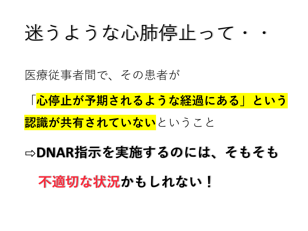 #31. 迷うような⼼肺停⽌って・・ 医療従事者間で、その患者が 「⼼停⽌が予期されるような経過にある」という 認識が共有されていないということ ⇨DNAR指⽰を実施するのには、そもそも 不適切な状況かもしれない!