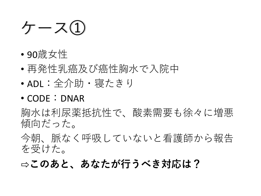 #33. ケース① • 90歳⼥性 • 再発性乳癌及び癌性胸⽔で⼊院中 • ADL:全介助・寝たきり • CODE:DNAR 胸⽔は利尿薬抵抗性で、酸素需要も徐々に増悪 傾向だった。 今朝、脈なく呼吸していないと看護師から報告 を受けた。 ⇨このあと、あなたが⾏うべき対応は?