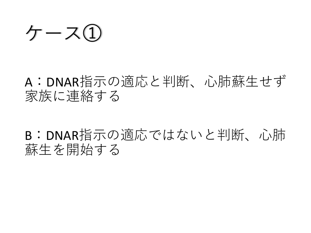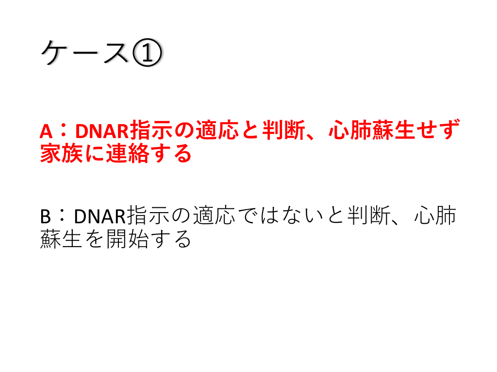 #34. ケース① A:DNAR指⽰の適応と判断、⼼肺蘇⽣せず 家族に連絡する B:DNAR指⽰の適応ではないと判断、⼼肺 蘇⽣を開始する