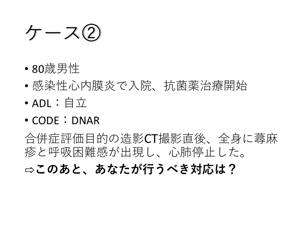 #36. ケース② • 80歳男性 • 感染性⼼内膜炎で⼊院、抗菌薬治療開始 • ADL:⾃⽴ • CODE:DNAR 合併症評価⽬的の造影CT撮影直後、全⾝に蕁⿇ 疹と呼吸困難感が出現し、⼼肺停⽌した。 ⇨このあと、あなたが⾏うべき対応は?