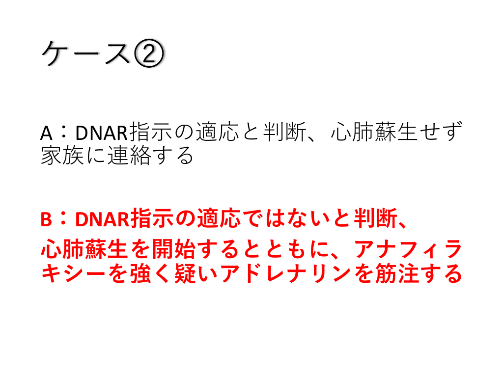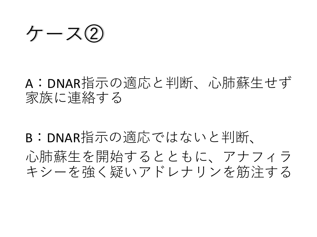 #38. ケース② A:DNAR指⽰の適応と判断、⼼肺蘇⽣せず 家族に連絡する B:DNAR指⽰の適応ではないと判断、 ⼼肺蘇⽣を開始するとともに、アナフィラ キシーを強く疑いアドレナリンを筋注する