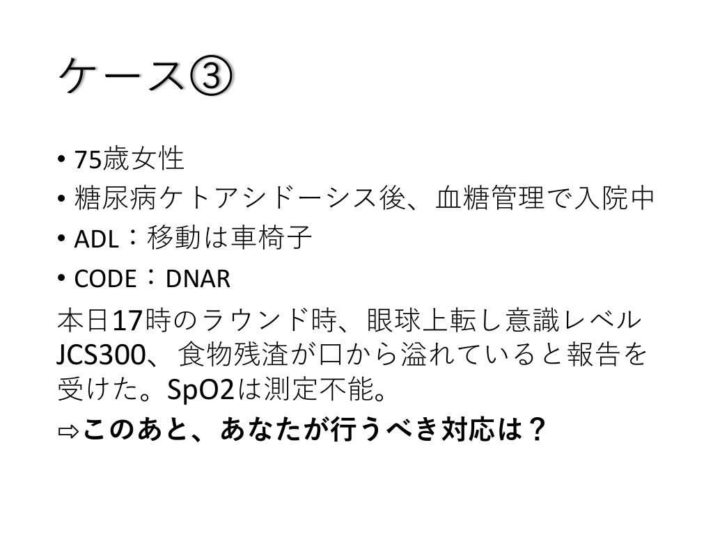 #39. ケース③ • 75歳⼥性 • 糖尿病ケトアシドーシス後、⾎糖管理で⼊院中 • ADL:移動は⾞椅⼦ • CODE:DNAR 本⽇17時のラウンド時、眼球上転し意識レベル JCS300、⾷物残渣が⼝から溢れていると報告を 受けた。SpO2は測定不能。 ⇨このあと、あなたが⾏うべき対応は?