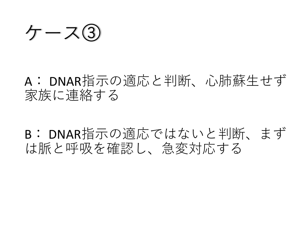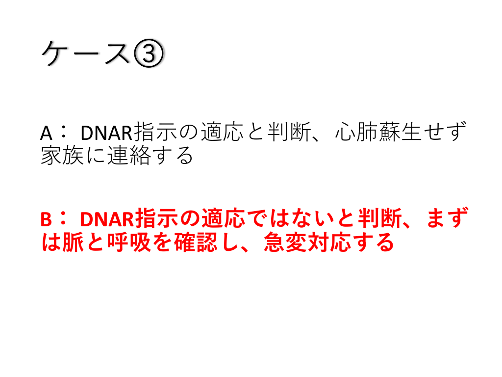 #41. ケース③ A: DNAR指⽰の適応と判断、⼼肺蘇⽣せず 家族に連絡する B: DNAR指⽰の適応ではないと判断、まず は脈と呼吸を確認し、急変対応する