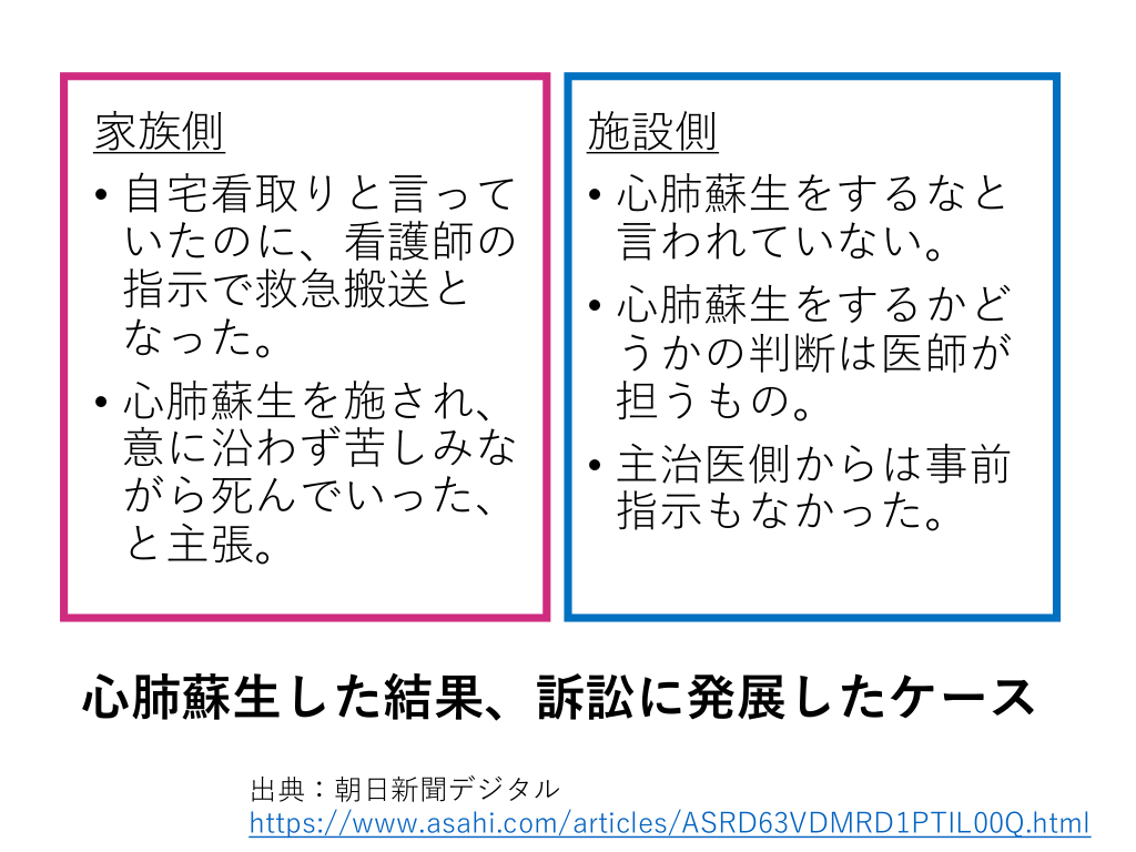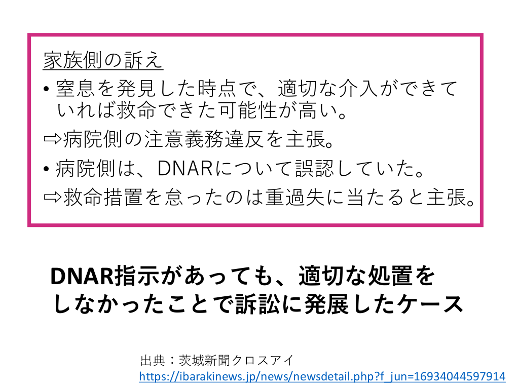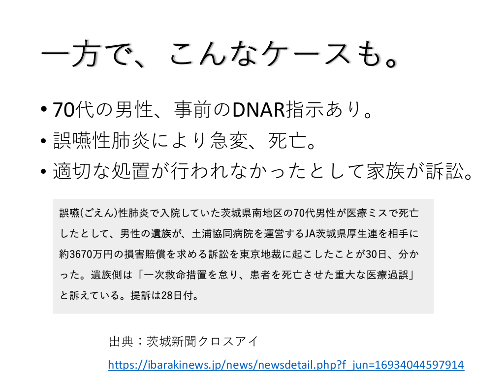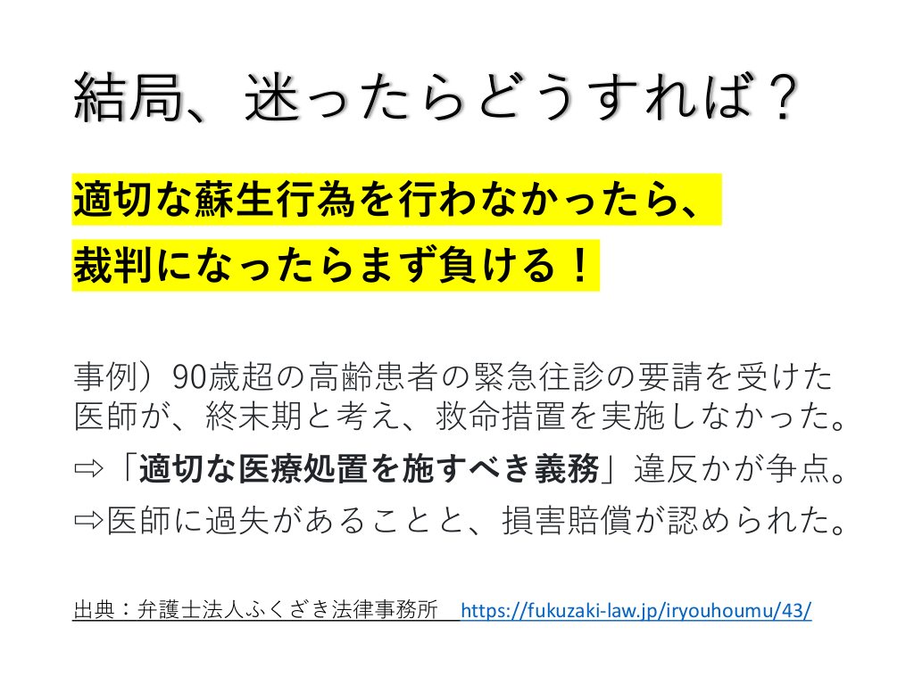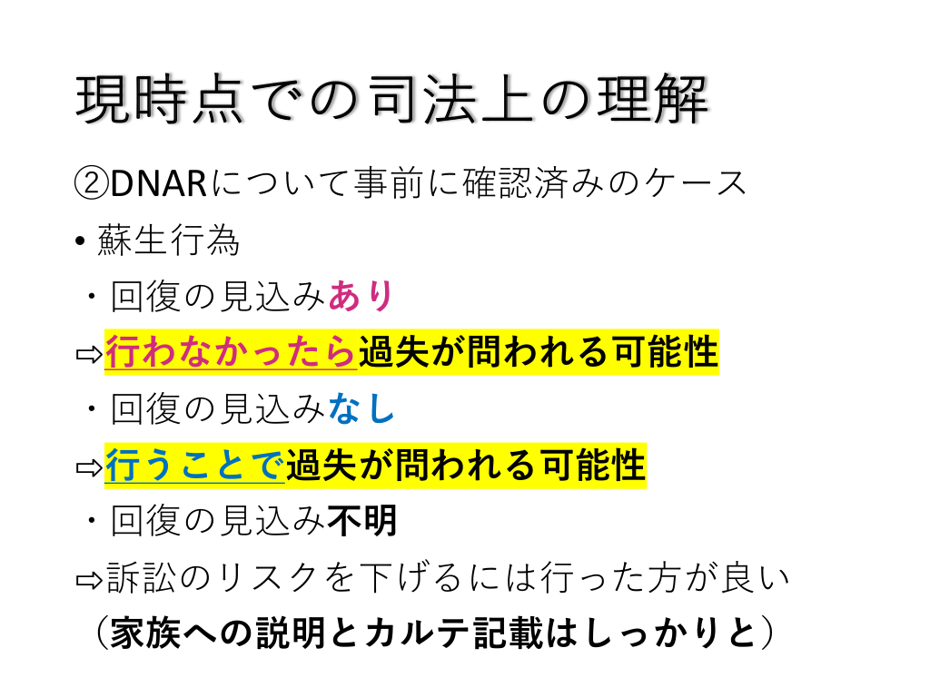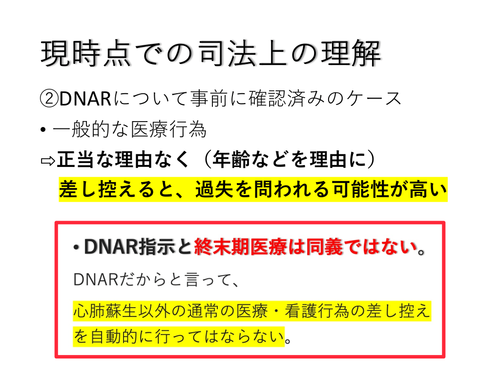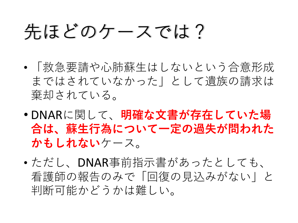 #48. 先ほどのケースでは? • 「救急要請や⼼肺蘇⽣はしないという合意形成 まではされていなかった」として遺族の請求は 棄却されている。 • DNARに関して、明確な⽂書が存在していた場 合は、蘇⽣⾏為について⼀定の過失が問われた かもしれないケース。 • ただし、DNAR事前指⽰書があったとしても、 看護師の報告のみで「回復の⾒込みがない」と 判断可能かどうかは難しい。