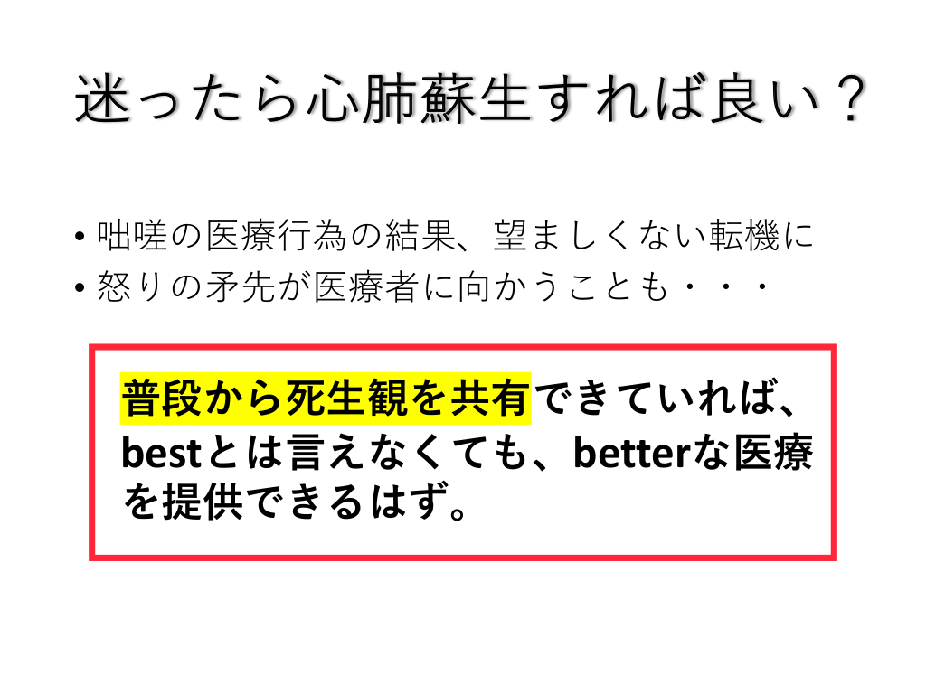 #46. 迷ったら⼼肺蘇⽣すれば良い? • 咄嗟の医療⾏為の結果、望ましくない転機に • 怒りの⽭先が医療者に向かうことも・・・ 普段から死⽣観を共有できていれば、 bestとは⾔えなくても、betterな医療 を提供できるはず。