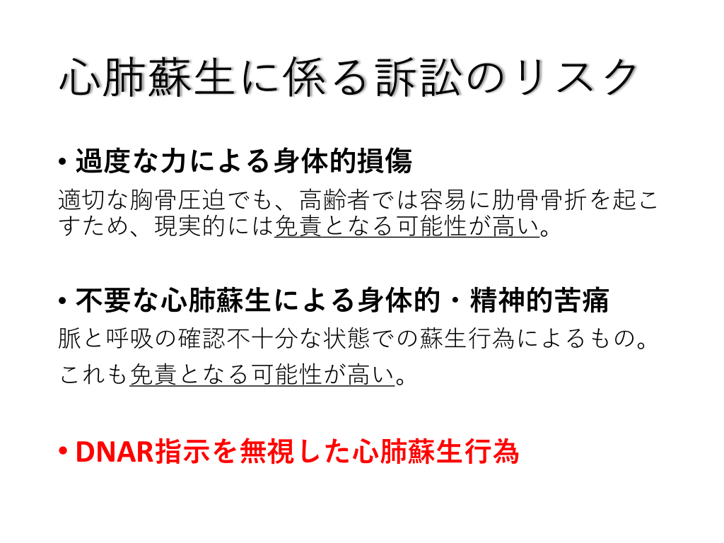 #47. ⼼肺蘇⽣に係る訴訟のリスク • 過度な⼒による⾝体的損傷 適切な胸⾻圧迫でも、⾼齢者では容易に肋⾻⾻折を起こ すため、現実的には免責となる可能性が⾼い。 • 不要な⼼肺蘇⽣による⾝体的・精神的苦痛 脈と呼吸の確認不⼗分な状態での蘇⽣⾏為によるもの。 これも免責となる可能性が⾼い。 • DNAR指⽰を無視した⼼肺蘇⽣⾏為