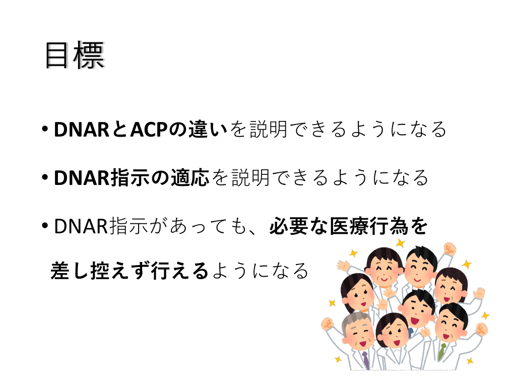 #5. ⽬標 • DNARとACPの違いを説明できるようになる • DNAR指⽰の適応を説明できるようになる • DNAR指⽰があっても、必要な医療⾏為を 差し控えず⾏えるようになる
