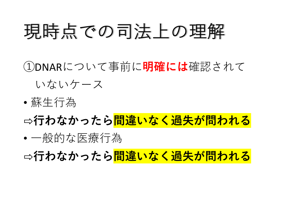 #52. 現時点での司法上の理解 ①DNARについて事前に明確には確認されて いないケース • 蘇⽣⾏為 ⇨⾏わなかったら間違いなく過失が問われる • ⼀般的な医療⾏為 ⇨⾏わなかったら間違いなく過失が問われる