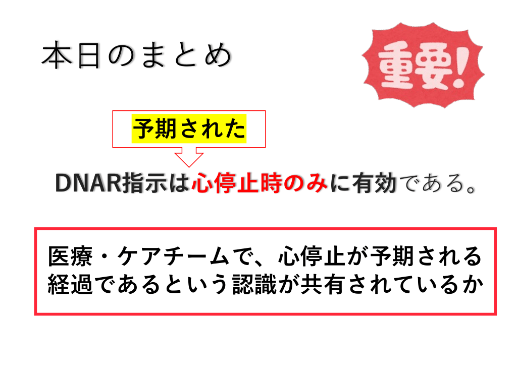 #56. 本⽇のまとめ 予期された DNAR指⽰は⼼停⽌時のみに有効である。 医療・ケアチームで、⼼停⽌が予期される 経過であるという認識が共有されているか
