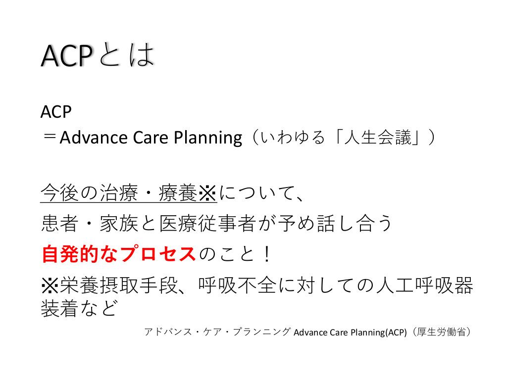 #7. ACPとは ACP =Advance Care Planning(いわゆる「⼈⽣会議」) 今後の治療・療養※について、 患者・家族と医療従事者が予め話し合う ⾃発的なプロセスのこと! ※栄養摂取⼿段、呼吸不全に対しての⼈⼯呼吸器 装着など アドバンス・ケア・プランニング Advance Care Planning(ACP)(厚⽣労働省)