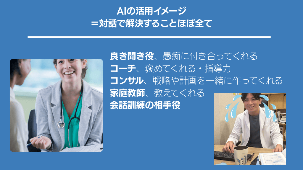 #10. AIの活用イメージ =対話で解決することほぼ全て 良き聞き役、愚痴に付き合ってくれる コーチ、褒めてくれる・指導力 コンサル、戦略や計画を一緒に作ってくれる 家庭教師、教えてくれる 会話訓練の相手役