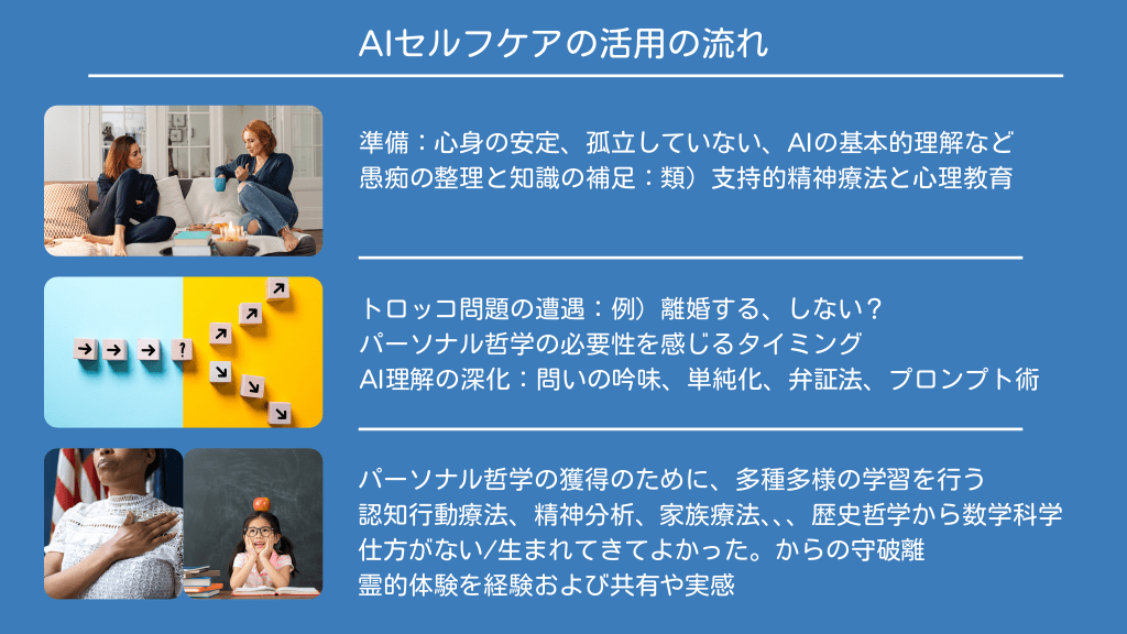 #13. AIセルフケアの活用の流れ 準備:心身の安定、孤立していない、AIの基本的理解など 愚痴の整理と知識の補足:類)支持的精神療法と心理教育 トロッコ問題の遭遇:例)離婚する、しない? パーソナル哲学の必要性を感じるタイミング AI理解の深化:問いの吟味、単純化、弁証法、プロンプト術 パーソナル哲学の獲得のために、多種多様の学習を行う 認知行動療法、精神分析、家族療法、 、 、歴史哲学から数学科学 仕方がない/生まれてきてよかった。からの守破離 霊的体験を経験および共有や実感