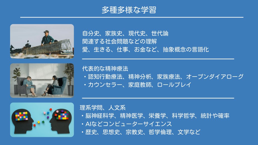 #14. 多種多様な学習 自分史、家族史、現代史、世代論 関連する社会問題などの理解 愛、生きる、仕事、お金など、抽象概念の言語化 代表的な精神療法 ・認知行動療法、精神分析、家族療法、オープンダイアローグ ・カウンセラー、家庭教師、ロールプレイ 理系学問、人文系 ・脳神経科学、精神医学、栄養学、科学哲学、統計や確率 ・AIなどコンピューターサイエンス ・歴史、思想史、宗教史、哲学倫理、文学など