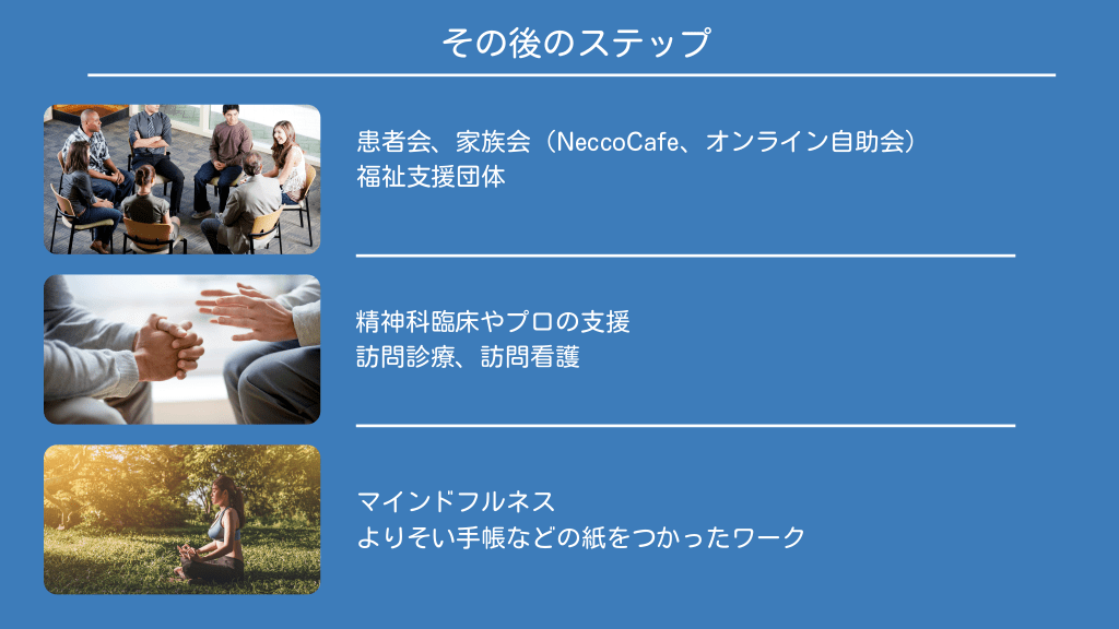#15. その後のステップ 患者会、家族会(NeccoCafe、オンライン自助会) 福祉支援団体 精神科臨床やプロの支援 訪問診療、訪問看護 マインドフルネス よりそい手帳などの紙をつかったワーク