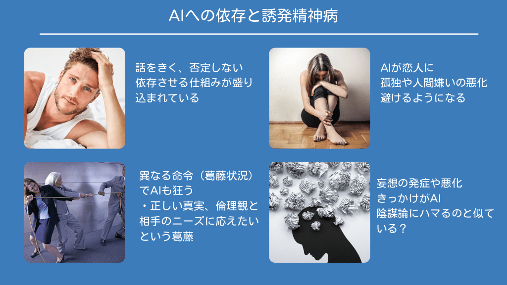 #16. AIへの依存と誘発精神病 話をきく、否定しない 依存させる仕組みが盛り 込まれている 異なる命令(葛藤状況) でAIも狂う ・正しい真実、倫理観と 相手のニーズに応えたい という葛藤 AIが恋人に 孤独や人間嫌いの悪化 避けるようになる 妄想の発症や悪化 きっかけがAI 陰謀論にハマるのと似て いる?