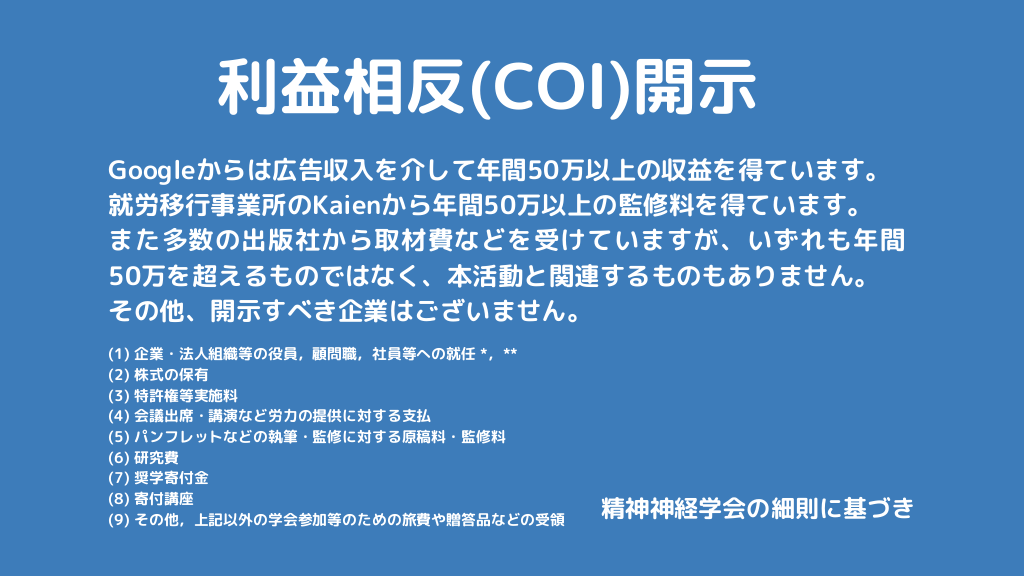 #2. 利益相反(COI)開示 Googleからは広告収入を介して年間50万以上の収益を得ています。 就労移行事業所のKaienから年間50万以上の監修料を得ています。 また多数の出版社から取材費などを受けていますが、いずれも年間 50万を超えるものではなく、本活動と関連するものもありません。 その他、開示すべき企業はございません。 (1) (2) (3) (4) (5) (6) (7) (8) (9) 企業・法人組織等の役員,顧問職,社員等への就任 *,** 株式の保有 特許権等実施料 会議出席・講演など労力の提供に対する支払 パンフレットなどの執筆・監修に対する原稿料・監修料 研究費 奨学寄付金 寄付講座 その他,上記以外の学会参加等のための旅費や贈答品などの受領 精神神経学会の細則に基づき