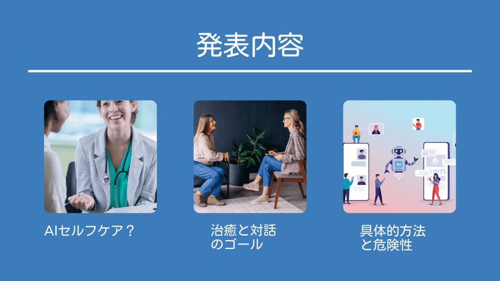 #3. 発表内容 AIセルフケア? 治癒と対話 のゴール 具体的方法 と危険性