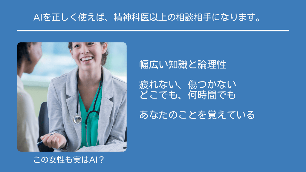 #5. AIを正しく使えば、精神科医以上の相談相手になります。 幅広い知識と論理性 疲れない、傷つかない どこでも、何時間でも あなたのことを覚えている この女性も実はAI?