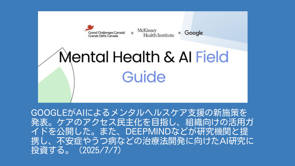 #6. GOOGLEがAIによるメンタルヘルスケア⽀援の新施策を 発表。ケアのアクセス⺠主化を⽬指し、組織向けの活⽤ガ イドを公開した。また、DEEPMINDなどが研究機関と提 携し、不安症やうつ病などの治療法開発に向けたAI研究に 投資する。(2025/7/7)