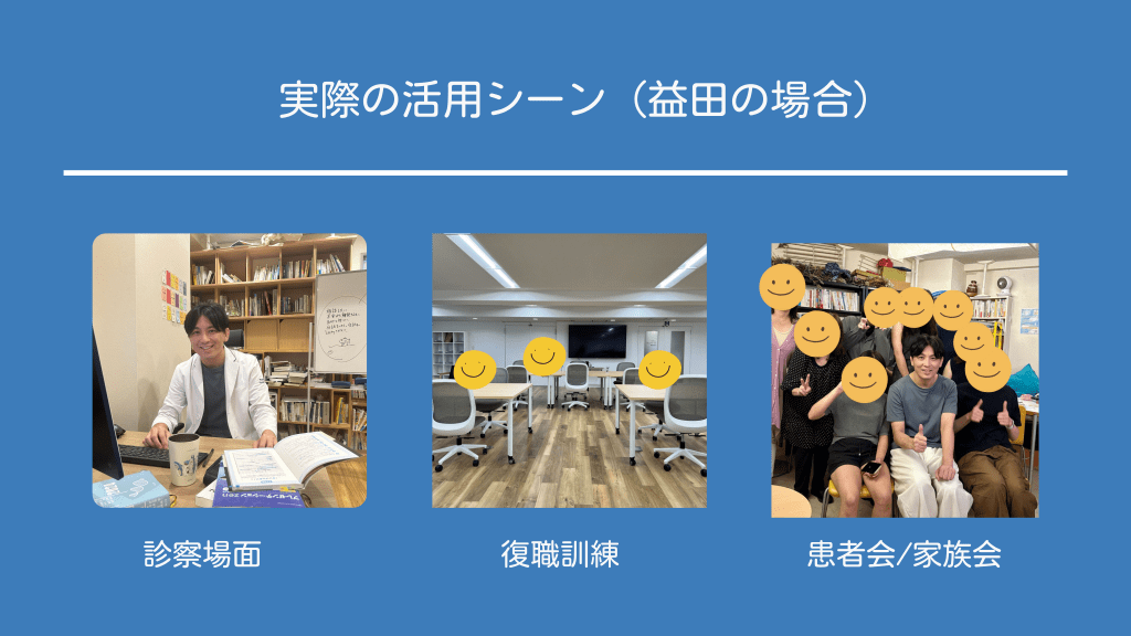 #7. 実際の活用シーン(益田の場合) 診察場面 復職訓練 患者会/家族会