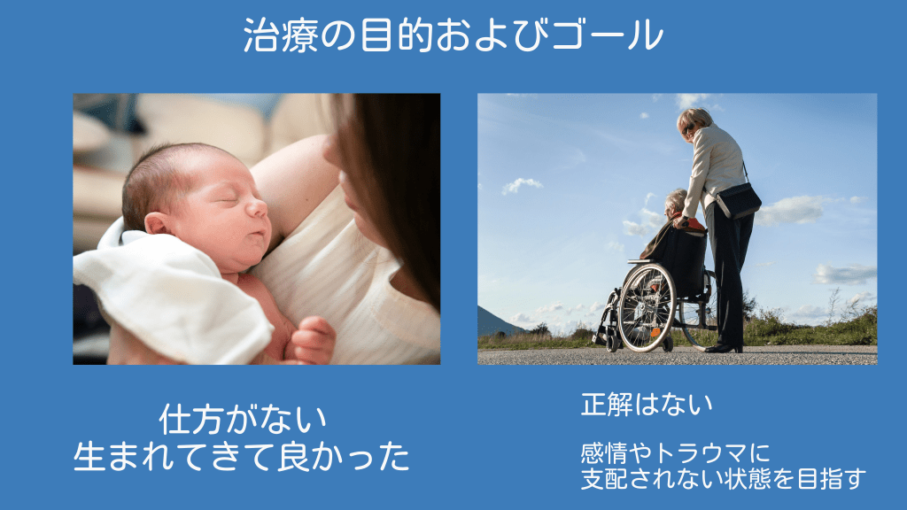 #9. 治療の⽬的およびゴール 仕⽅がない ⽣まれてきて良かった 正解はない 感情やトラウマに ⽀配されない状態を⽬指す